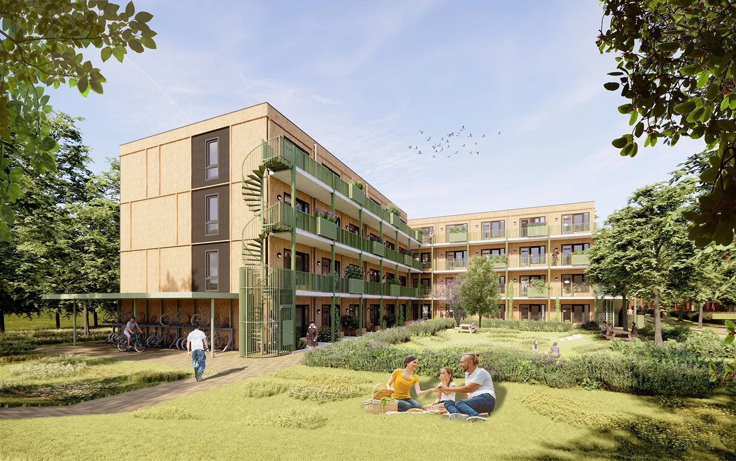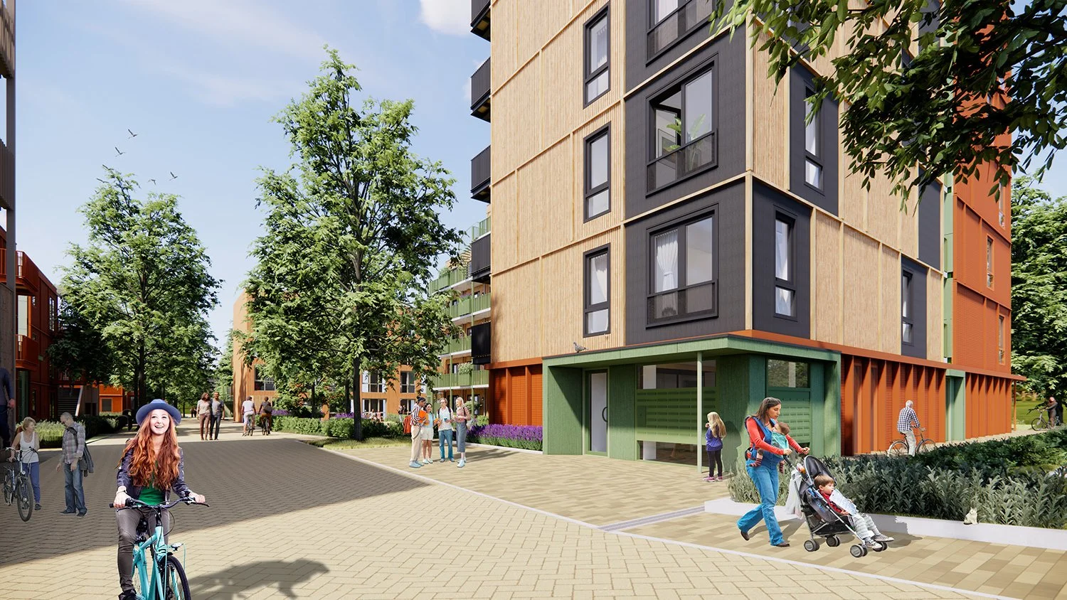 Dankzij modulaire bouw in de fabriek, duurt de bouw maar een jaar.Centraal komen er voorzieningen rond een plein aan het Abcouderfietspad.